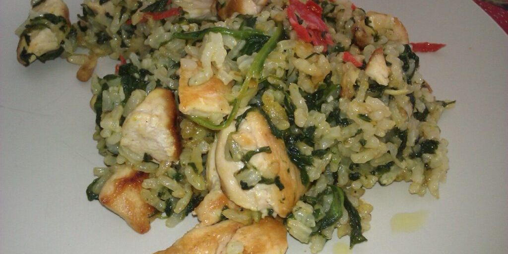 Saltear en una sartén con aceite la cebolla en trocitos pequeños y añadir enseguida los taquitos de pollo. Saltear hasta que el pollo esté bien hecho y dorado. Después añadir el arroz y las espinacas (con el pimiento morrón al gusto), añadir una pizca de sal, saltear junto durante un momento.