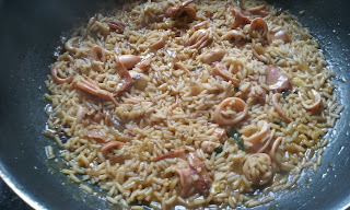 Cuando hayan pasado aproximadamente unos 10 minutos, incorporamos el arroz, una pizca de sal, lo movemos bien para que quede repartido y lo dejamos cocer parcialmente tapado unos 15 minutos. Después tapar del todo y apagar el fuego.