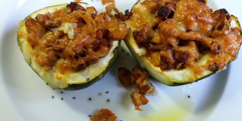 Sacamos los calabacines del horno y los rellenamos con la mezcla de sofrito de verduras y pollo.