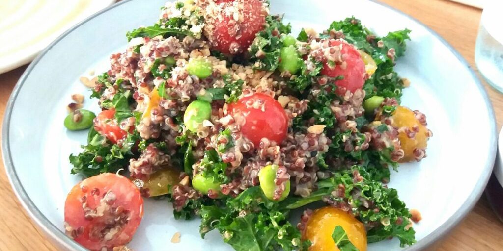 Cuando ya tengamos la quinoa y el kale preparados, mezclamos con los tomates cherry y con las avellanas (previamente troceadas para dar un toque crujiente a la ensalada), añadimos algún ingrediente extra si lo deseamos y un poco de vinagre de Módena o una buena vinagreta.