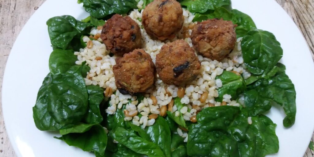 Servimos en un plato con una base de hojas de espinacas frescas, 100g de arroz integral cocido y 5 o 6 albóndigas por persona (depende del hambre y del tamaño 😉