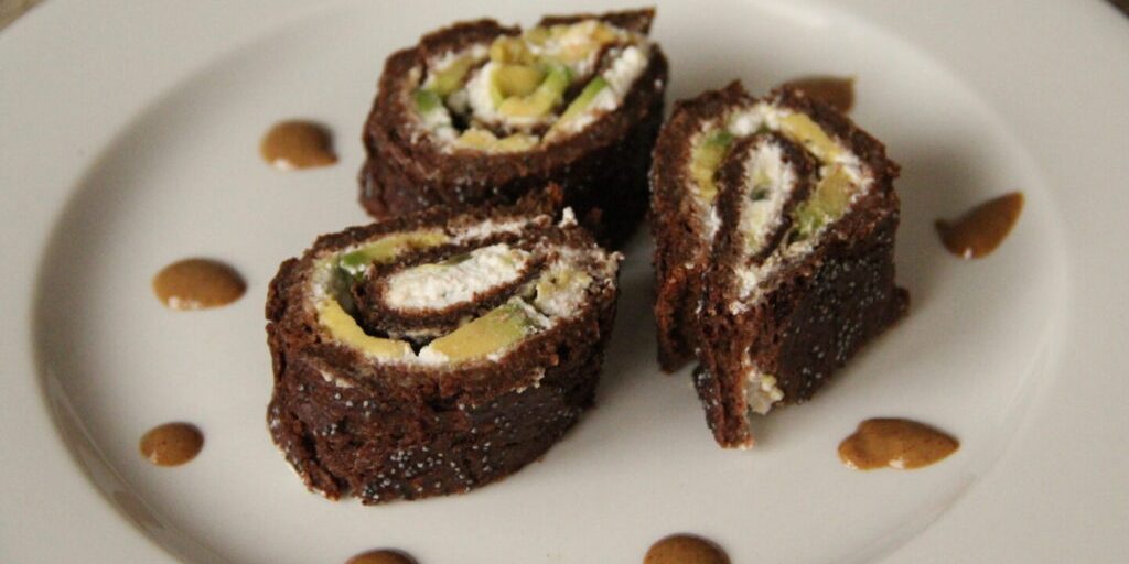 Cuando esté fría, sacad la masa de la bandeja y rellenad (dejando la parte con las semillas en el exterior) con el aguacate y el mató bien repartido, enrolladlo y cortad en rodajas pequeñas o porciones individuales (a modo de pastelito).